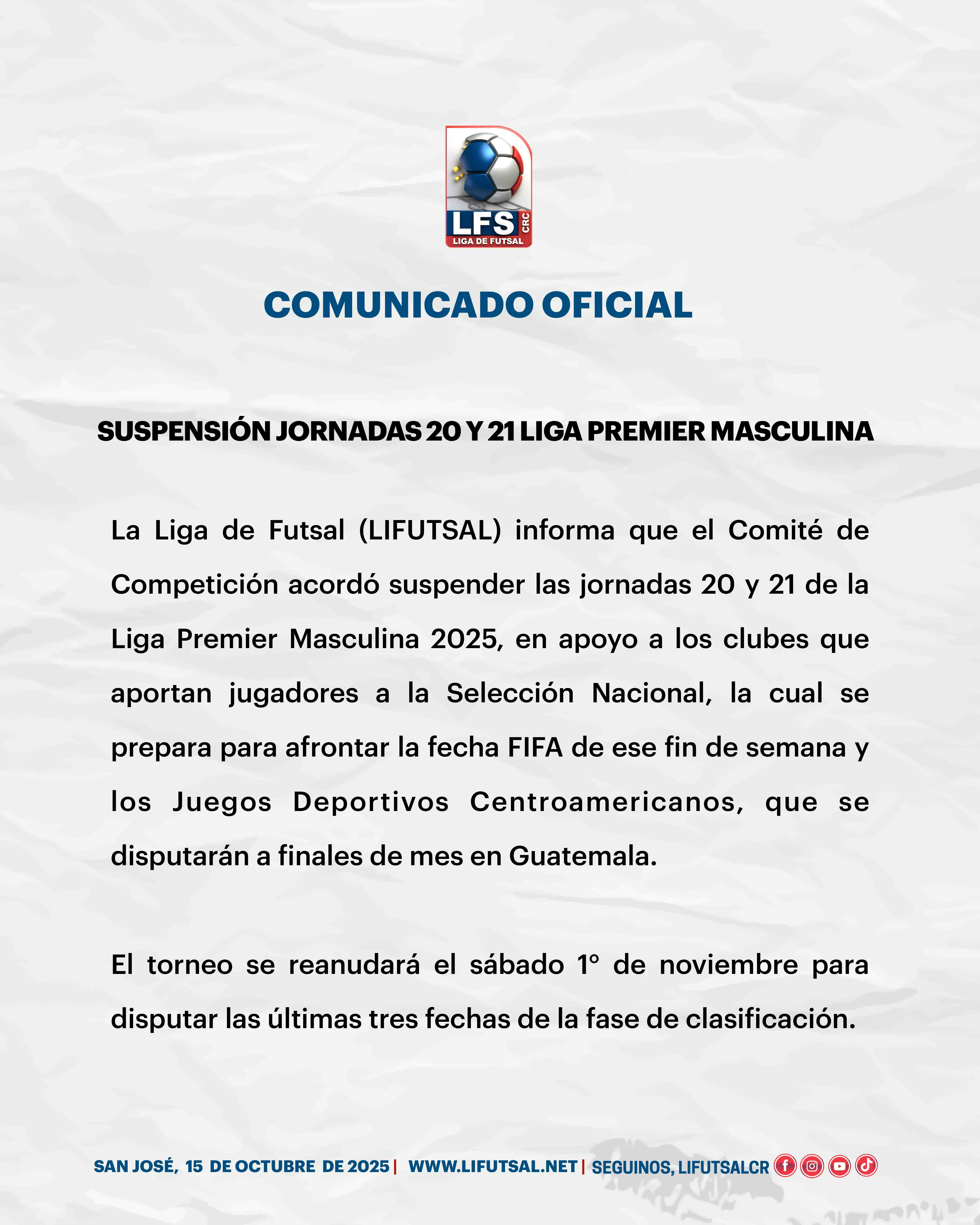 La Liga de Futsal (LIFUTSAL) informa que el Comité de Competición acordó suspender las jornadas 20 y 21 de la Liga Premier Masculina 2025, en apoyo a los clubes que aportan jugadores a la Selección Nacional, la cual se prepara para afrontar la fecha FIFA de ese fin de semana y los Juegos Deportivos Centroamericanos, que se disputarán a finales de mes en Guatemala.