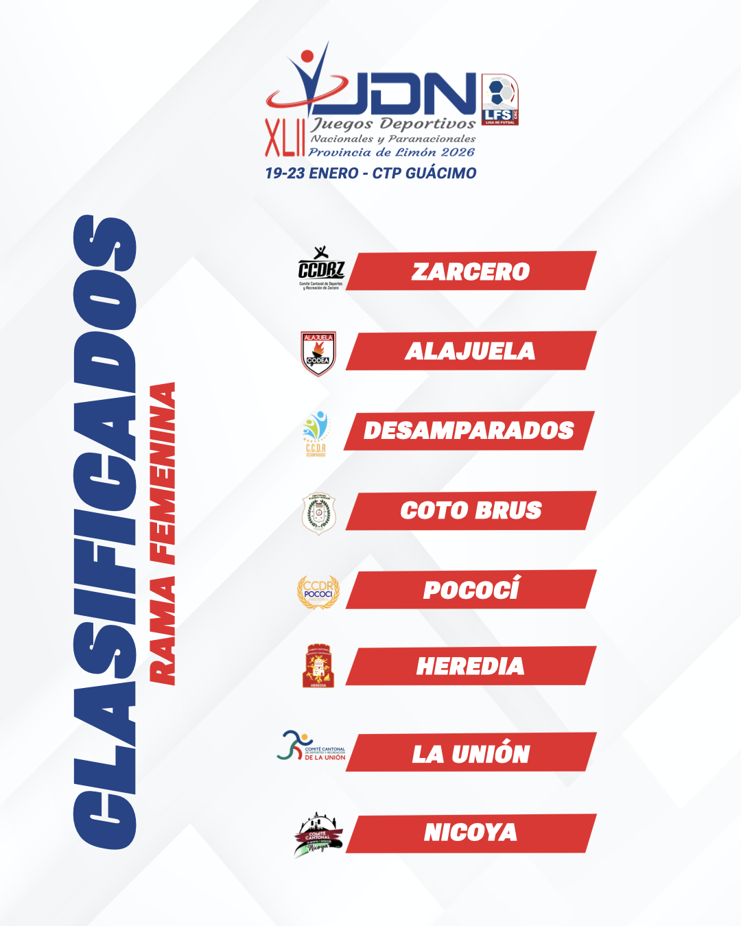 En la categoría femenina, los equipos clasificados son: Zarcero, Alajuela, Desamparados, Coto Brus, Pococí, Heredia, La Unión y Nicoya, los cuales se ganaron el derecho de pelear por las medallas en la máxima cita deportiva del país.