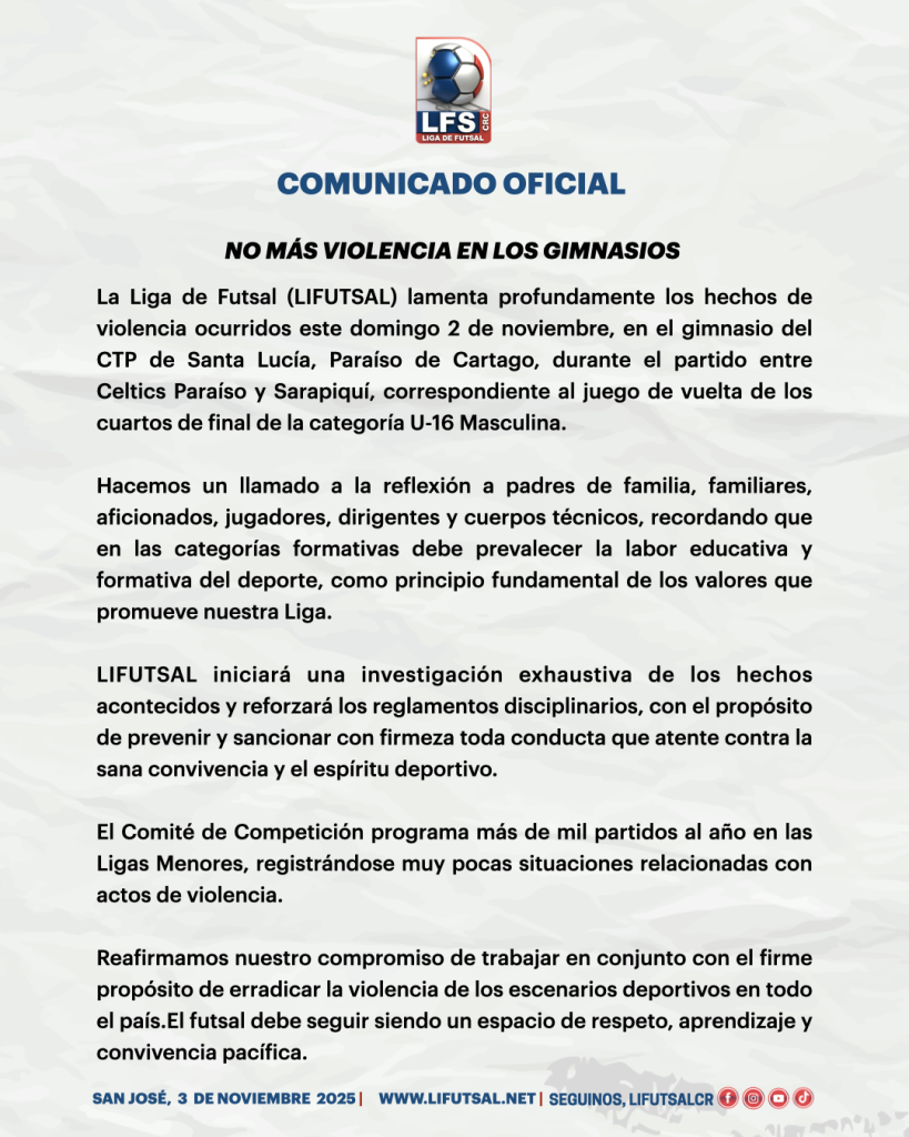 La Liga de Futsal (LIFUTSAL) lamenta profundamente los hechos de violencia ocurridos este domingo 2 de noviembre, en el gimnasio del CTP de Santa Lucía, Paraíso de Cartago, durante el partido entre Celtics Paraíso y Sarapiquí, correspondiente al juego de vuelta de los cuartos de final de la categoría U-16 Masculina.